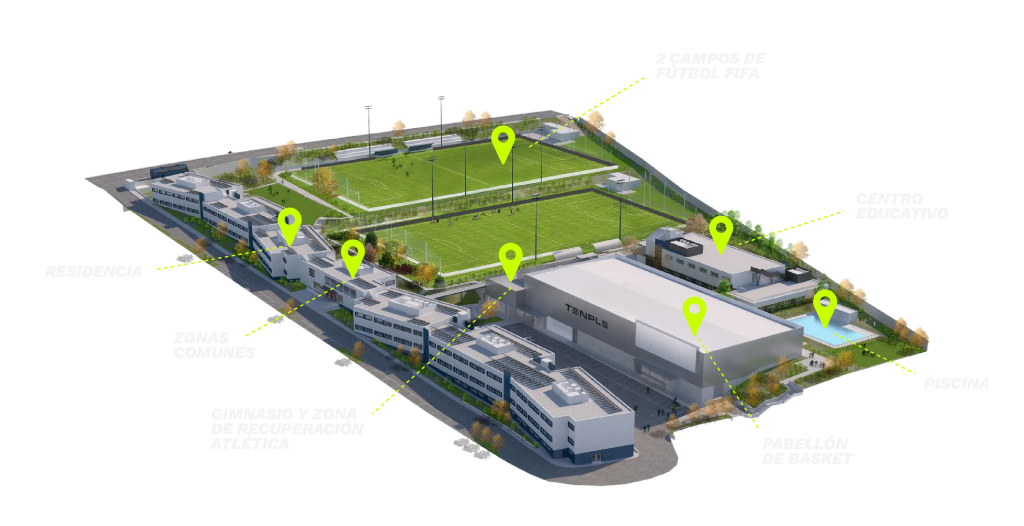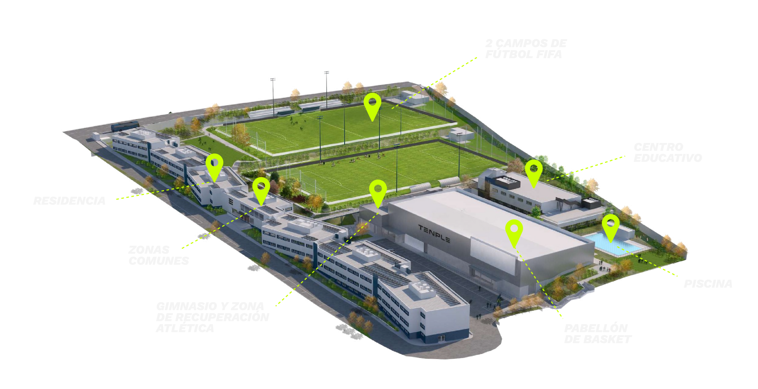2 campos de césped natural con medidas FIFA, zonas de entrenamiento especializadas y cámaras inteligentes para análisis de partidos y entrenamientos.
